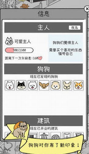 2、游戏满级30级,等级限制了玩家能获得狗狗的数量以及房屋和狗狗的级数上限。