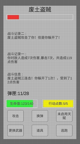 使用枪械类武器时需要注意弹夹中的子弹量,当子弹量不足时将无法使用枪械造成伤害,弹药量为零时使用【攻击】会对目标无消耗造成一倍基础攻击力的伤害,在每次开始战斗时,会消耗背包里相应的弹药进行填装,战斗中打光弹夹中的子弹后可以使用【换弹】按钮进行填装,弹药不足时仅部分填基。