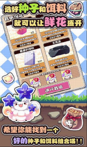 将猫咪花盆的种子,花盆以及饵料机械能组合,就能诞生出新品种。组合方式是有规律的,利用组合逐渐摸索出所有种类的猫咪花盆吧。