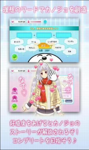 经典的日系假想女友游戏,走剧情涨好感,多结局等经典套路当然是不会少,重点是游戏的口号就是为玩家打造理想女朋友,所以当好感度足够的时候,你希望女友是什么样子的,她就会变成什么样子!是不是很贴心呢?