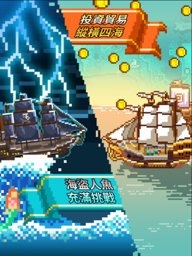 1、以像素画风为主的经营养成类游戏,游戏中玩家需要购买自己的大船,在海洋中开始自己的冒险。