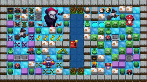 炸弹人是FC上的一款经典游戏,不论是游戏的玩法还是游戏中那轻快欢乐的背景音乐,都让人记忆深刻。这款游戏的玩法其实很简单,就是地图上安放炸弹来消灭所有敌人,然后找到隐藏在砖块中的门进入下一关。游戏的每一关都有不同的地图和怪物,并且每一关都有一个道具隐藏在砖块中,这些道具有增加可安放炸弹的数量的,有加快主角移动速度的,有控制炸弹爆炸时间的等等。