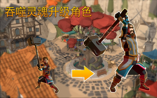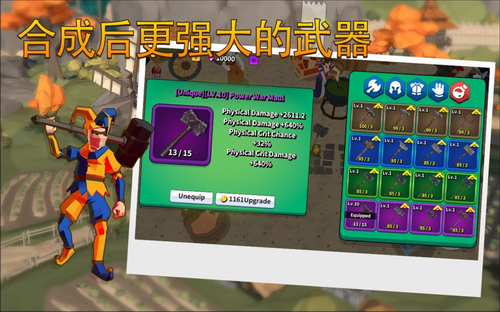 1、随着等级提高角色变得越来越巨大合成碎片获得更强力的武器和装备;