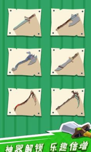 1、游戏中有着多种不同的斧子可供玩家选用,需要快速的将关卡一根根木条拼接而成的木板切割开。