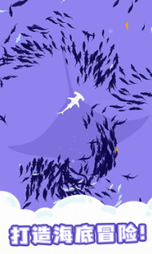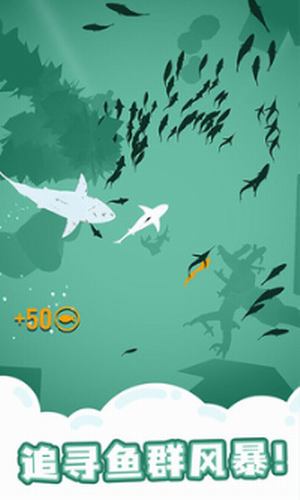 1、控制鲨鱼在海底世界自由探索,追捕鱼群,作为自己的盘中餐。