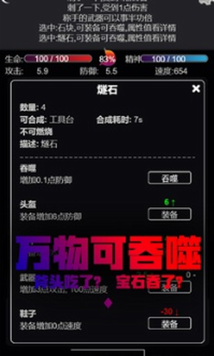 1.丰富的吞食玩法,超过上百物品,石头、刀剑的也能吞,强化自身来升级。