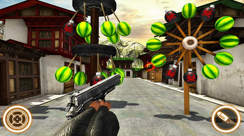 3、你需要通过避免地雷和炸弹用枪射击目标,如果你射击炸弹而不是西瓜,射击游戏将结束。