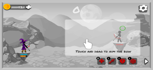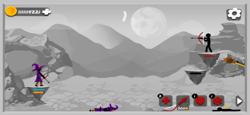 1.通过拉取控制火柴人射箭的角度和力道,按的越久力道越大