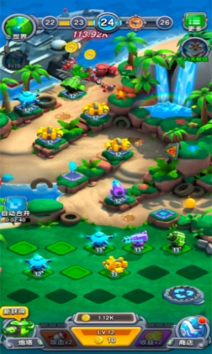 2. 合并升级炮塔,有策略的搭配各类炮塔,抵抗不同的敌人